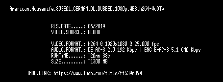 | FiLENAME: | American.Housewife.S03E01.GERMAN.DL.DUBBED.1080p.WEB.h264-VoDTv.mkv |