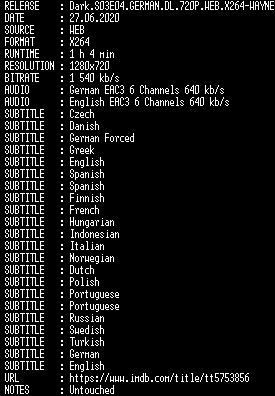 | FiLENAME: | Dark.S03E04.GERMAN.DL.720P.WEB.X264-WAYNE.mkv |