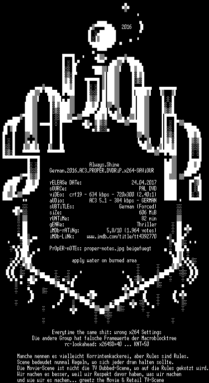| FiLENAME: | Always.Shine.German.2016.AC3.PROPER.DVDRiP.x264.READNFO-SAViOUR.mkv |