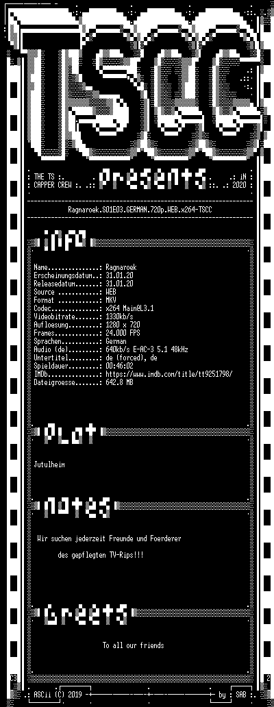 | FiLENAME: | Ragnaroek.S01E03.GERMAN.720p.WEB.x264-TSCC.mkv |