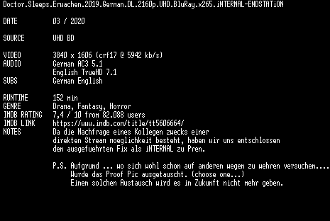 | FiLENAME: | Doctor.Sleeps.Erwachen.2019.German.DL.2160p.UHD.BluRay.x265.iNTERNAL-ENDSTATiON.mkv |