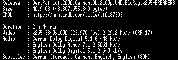 | FiLENAME: | Der.Patriot.2000.German.DL.2160p.UHD.BluRay.x265-BREAKERS.mkv |