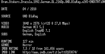 | FiLENAME: | Bram.Stokers.Dracula.1992.German.DL.2160p.UHD.BluRay.x265-ENDSTATiON.mkv |