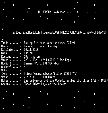 | FiLENAME: | Bailey.Ein.Hund.kehrt.zurueck.GERMAN.2019.AC3.BDRip.x264-UNiVERSUM.mkv |