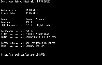 | FiLENAME: | Der.grosse.Gatsby.German.BDRiP.x264-EXQUiSiTE.mkv |