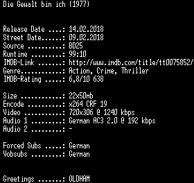 | FiLENAME: | Die.Gewalt.bin.ich.German.REMASTERED.1977.AC3.BDRip.x264-SPiCY.mkv |