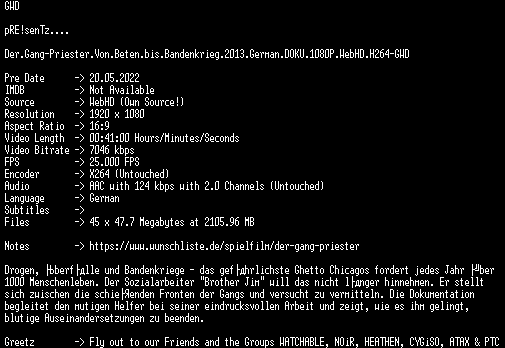 | FiLENAME: | Der.Gang-Priester.Von.Beten.bis.Bandenkrieg.2013.German.DOKU.1080P.WebHD.H264-GWD.mkv |