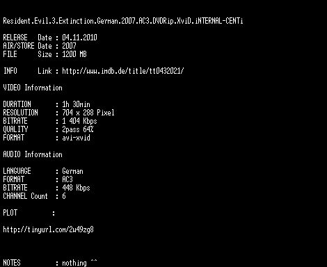 | FiLENAME: | Resident Evil 3 - Extinction (2007) [GER-AC3 WS DVD].avi |