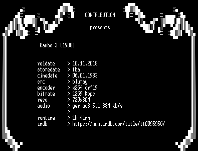 | FiLENAME: | Rambo.3.1988.Remastered.German.BDRip.x264-CONTRiBUTiON.mkv |