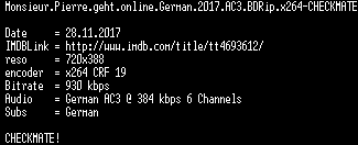 | FiLENAME: | Monsieur.Pierre.geht.online.German.2017.AC3.BDRip.x264-CHECKMATE.mkv |