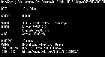 | FiLENAME: | Der.Koenig.Der.Loewen.1994.German.DL.2160p.UHD.BluRay.x265-ENDSTATiON.mkv |