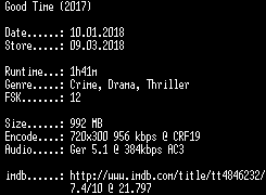 | FiLENAME: | Good.Time.German.2017.AC3.BDRip.x264-CiNEViSiON.mkv |