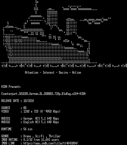 | FiLENAME: | Counterpart.S01E08.German.DL.DUBBED.720p.BluRay.x264-AIDA.mkv |