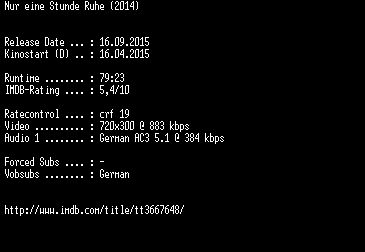 | FiLENAME: | Nur.eine.Stunde.Ruhe.German.2014.AC3.BDRiP.x264-EXQUiSiTE.mkv |