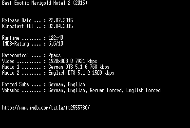 | FiLENAME: | Best.Exotic.Marigold.Hotel.2.2015.German.DTS.DL.1080p.BluRay.x264-EXQUiSiTE.mkv |