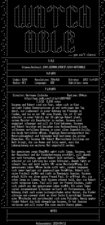 | FiLENAME: | Gruene.Hochzeit.1989.GERMAN.DVDRIP.X264-WATCHABLE.mkv |