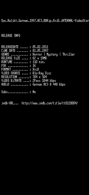 | FiLENAME: | Das.Relikt.German.1997.AC3.BDRip.XviD.iNTERNAL-VideoStar.avi |