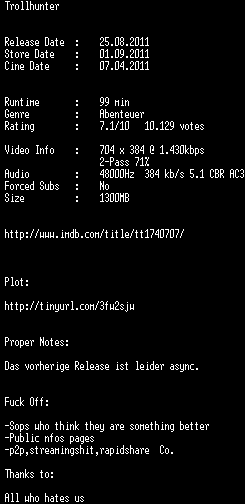 | FiLENAME: | Trollhunter.German.AC3.PROPER.DVDRip.XviD-DiSTRiCT.avi |