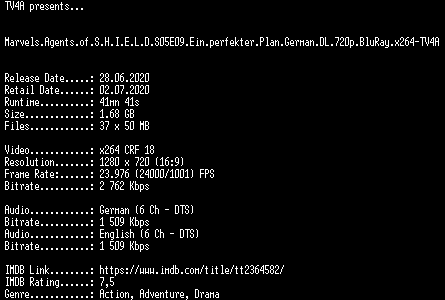 | FiLENAME: | Marvels.Agents.of.S.H.I.E.L.D.S05E09.Ein.perfekter.Plan.German.DL.720p.BluRay.x264-TV4A.mkv |