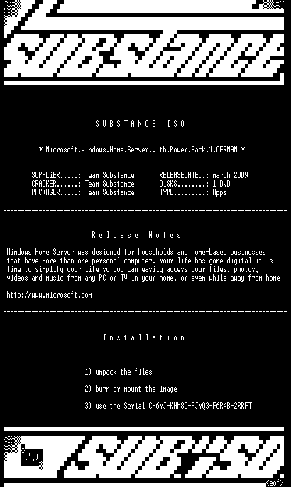 | FiLENAME: | Microsoft Windows Home Server with Power Pack 1 GERMAN-Substance.iso |
