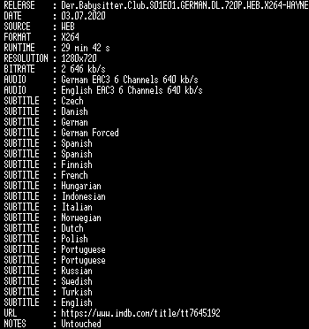 | FiLENAME: | Der.Babysitter.Club.S01E01.GERMAN.DL.720P.WEB.X264-WAYNE.mkv |