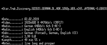| FiLENAME: | Star.Trek.Discovery.S02E03.GERMAN.DL.HDR.1080p.WEBRip.x265.iNTERNAL-EiSBOCK.mkv |