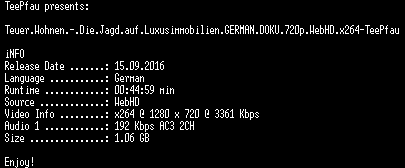 | FiLENAME: | Teuer.Wohnen.-.Die.Jagd.auf.Luxusimmobilien.GERMAN.DOKU.720p.WebHD.x264-TeePfau.mkv |
