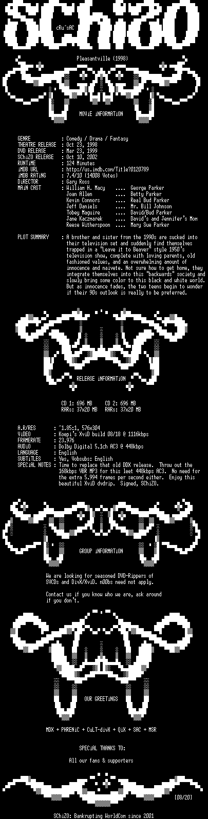 | FiLENAME: | Pleasantville.1998.AC3.INTERNAL.DVDRip.XviD-SChiZO.CD2.avi |