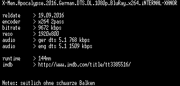 | FiLENAME: | X-Men.Apocalypse.2016.German.DTS.DL.1080p.BluRay.x264.iNTERNAL-XANOR.mkv |