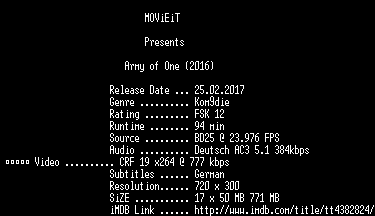 | FiLENAME: | Army.of.One.German.2016.AC3.BDRip.x264-MOViEiT.mkv |