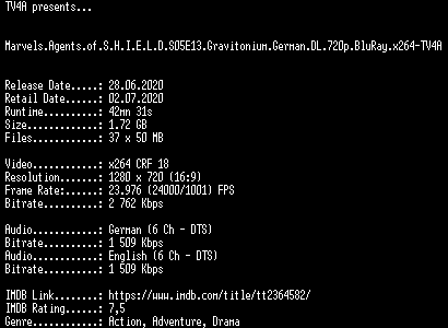 | FiLENAME: | Marvels.Agents.of.S.H.I.E.L.D.S05E13.Gravitonium.German.DL.720p.BluRay.x264-TV4A.mkv |