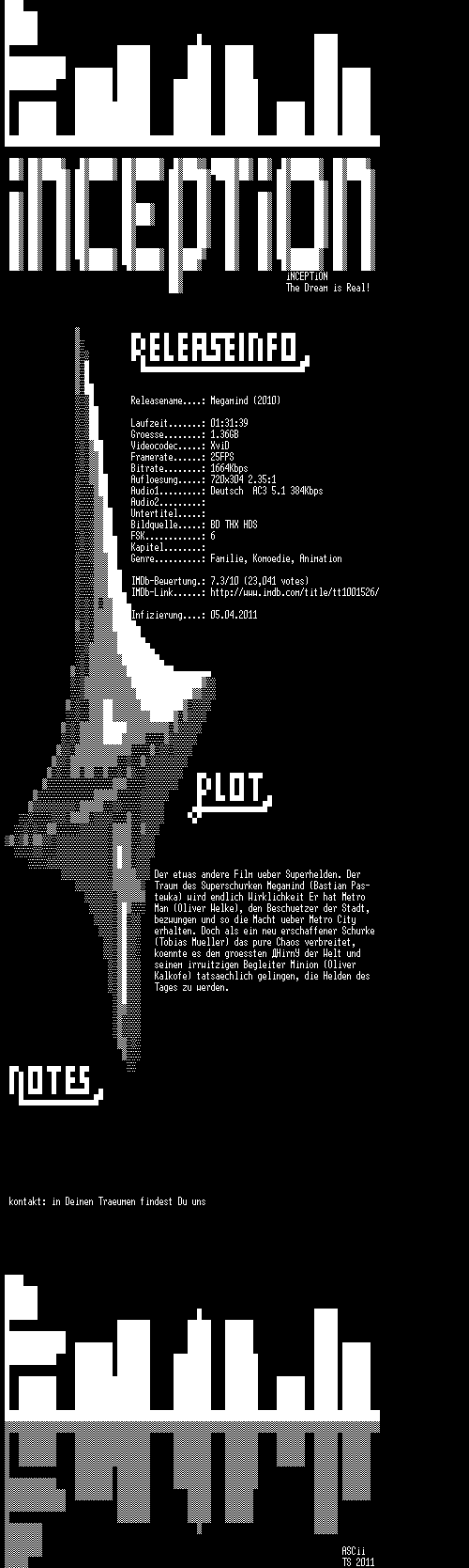 | FiLENAME: | Megamind.2010.German.AC3.BDRip.XviD-iNCEPTiON.avi |