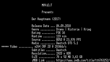 | FiLENAME: | Der.Hauptmann.2017.German.1080p.BluRay.x264-MOViEiT.mkv |