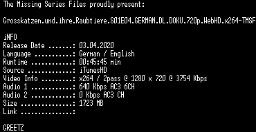 | FiLENAME: | Grosskatzen.und.ihre.Raubtiere.S01E04.GERMAN.DL.DOKU.720p.WebHD.x264-TMSF.mkv |