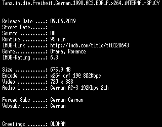 | FiLENAME: | Tanz.in.die.Freiheit.German.1998.AC3.BDRiP.x264.iNTERNAL-SPiCY.mkv |