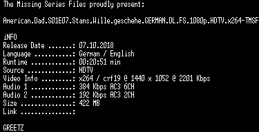 | FiLENAME: | American.Dad.S01E07.Stans.Wille.geschehe.GERMAN.DL.FS.1080p.HDTV.x264-TMSF.mkv |