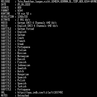 | FiLENAME: | Tote.Maedchen.luegen.nicht.S04E04.GERMAN.DL.720P.WEB.X264-WAYNE.mkv |