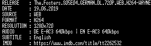 | FiLENAME: | The.Fosters.S05E04.GERMAN.DL.720P.WEB.H264-WAYNE.mkv |
