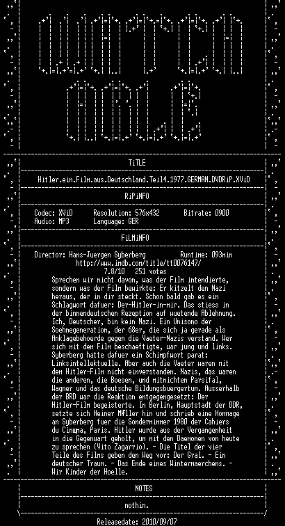 | FiLENAME: | Hitler.ein.Film.aus.Deutschland.Teil4.1977.GERMAN.DVDRiP.XViD-WATCHABLE.avi |