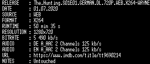 | FiLENAME: | The.Hunting.S01E01.GERMAN.DL.720P.WEB.X264-WAYNE.mkv |