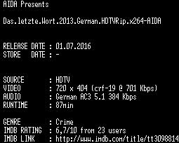 | FiLENAME: | Das.letzte.Wort.2013.German.HDTVRip.x264-AIDA.mkv |