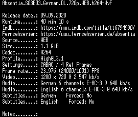 | FiLENAME: | Absentia.S03E03.German.DL.720p.WEB.h264-WvF.mkv |