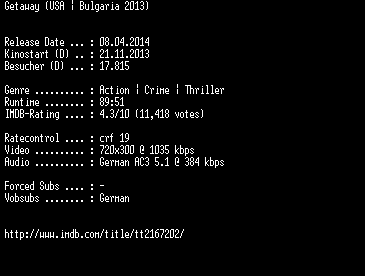 | FiLENAME: | Getaway.German.BDRiP.x264-EXQUiSiTE.mkv |