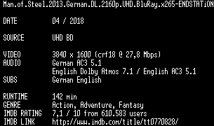 | FiLENAME: | Man.of.Steel.2013.German.DL.2160p.UHD.BluRay.x265-ENDSTATiON.mkv |