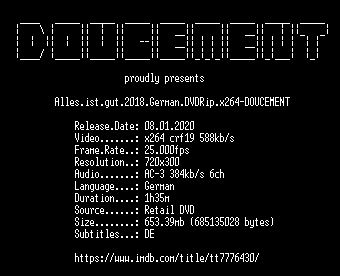 | FiLENAME: | Alles.ist.gut.2018.German.DVDRip.x264-DOUCEMENT.mkv |