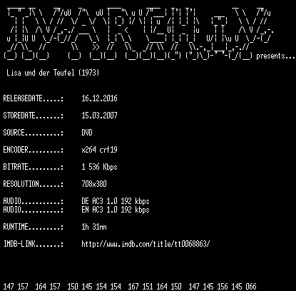 | FiLENAME: | Lisa.und.der.Teufel.1973.German.DL.DVDRip.x264.iNTERNAL-TVARCHiV.mkv |