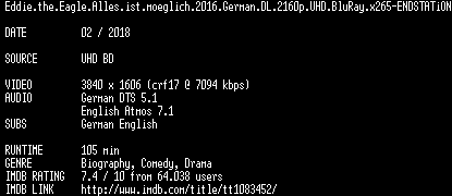 | FiLENAME: | Eddie.the.Eagle.Alles.ist.moeglich.2016.German.DL.2160p.UHD.BluRay.x265-ENDSTATiON.mkv |