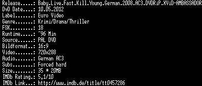 | FiLENAME: | Baby.Live.Fast.Kill.Young.German.2008.AC3.DVDRiP.XViD-AMBASSADOR.avi |
