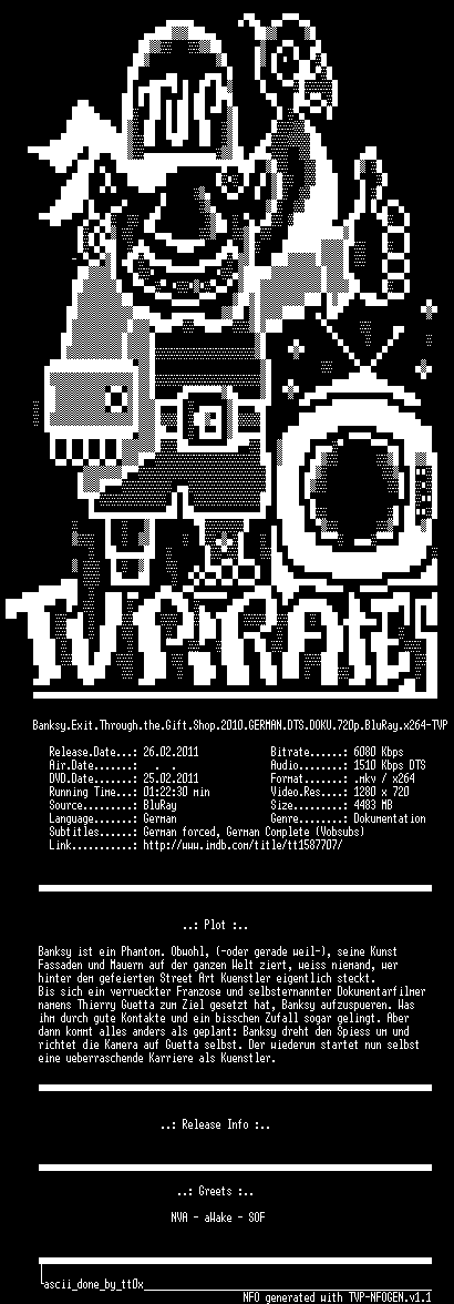 | FiLENAME: | Banksy - Exit Through the Gift Shop (2010) [GER-dts 720p BD].mkv |