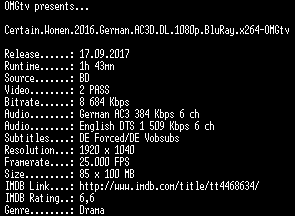 | FiLENAME: | Certain.Women.2016.German.AC3D.DL.1080p.BluRay.x264-OMGtv.mkv |
